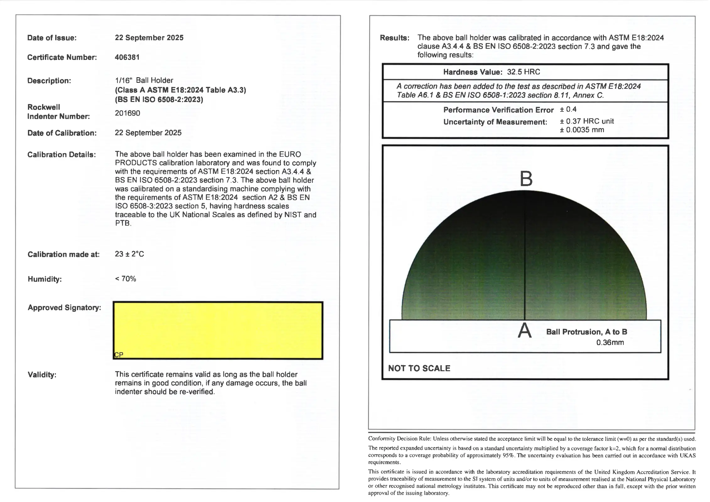 • Calibrated to both EN ISO 6508-2 & ASTM E18.
